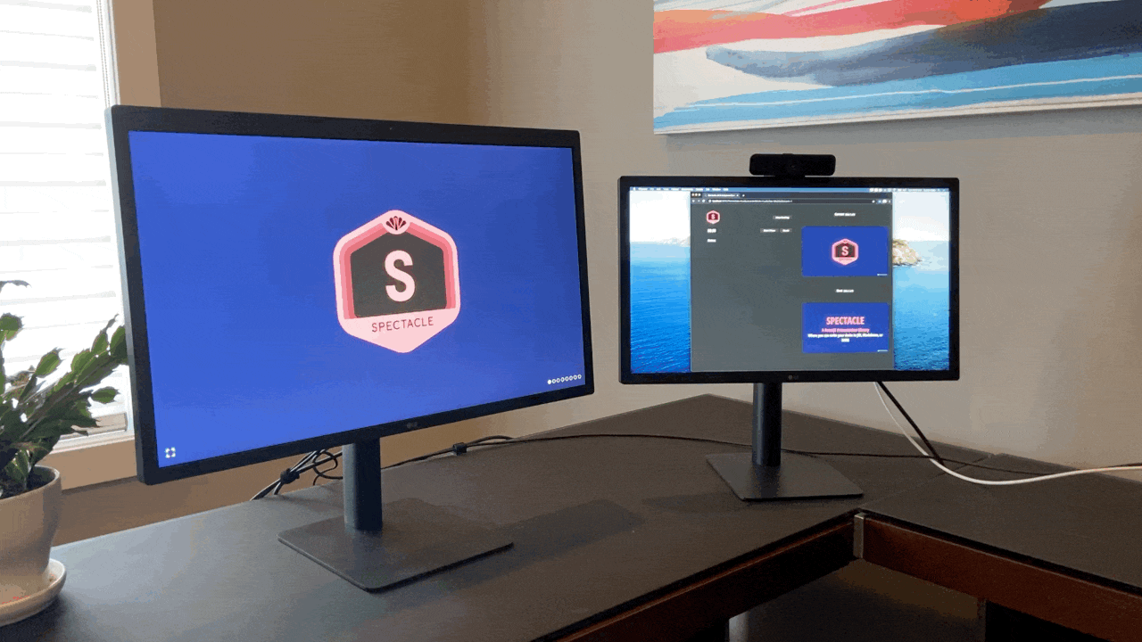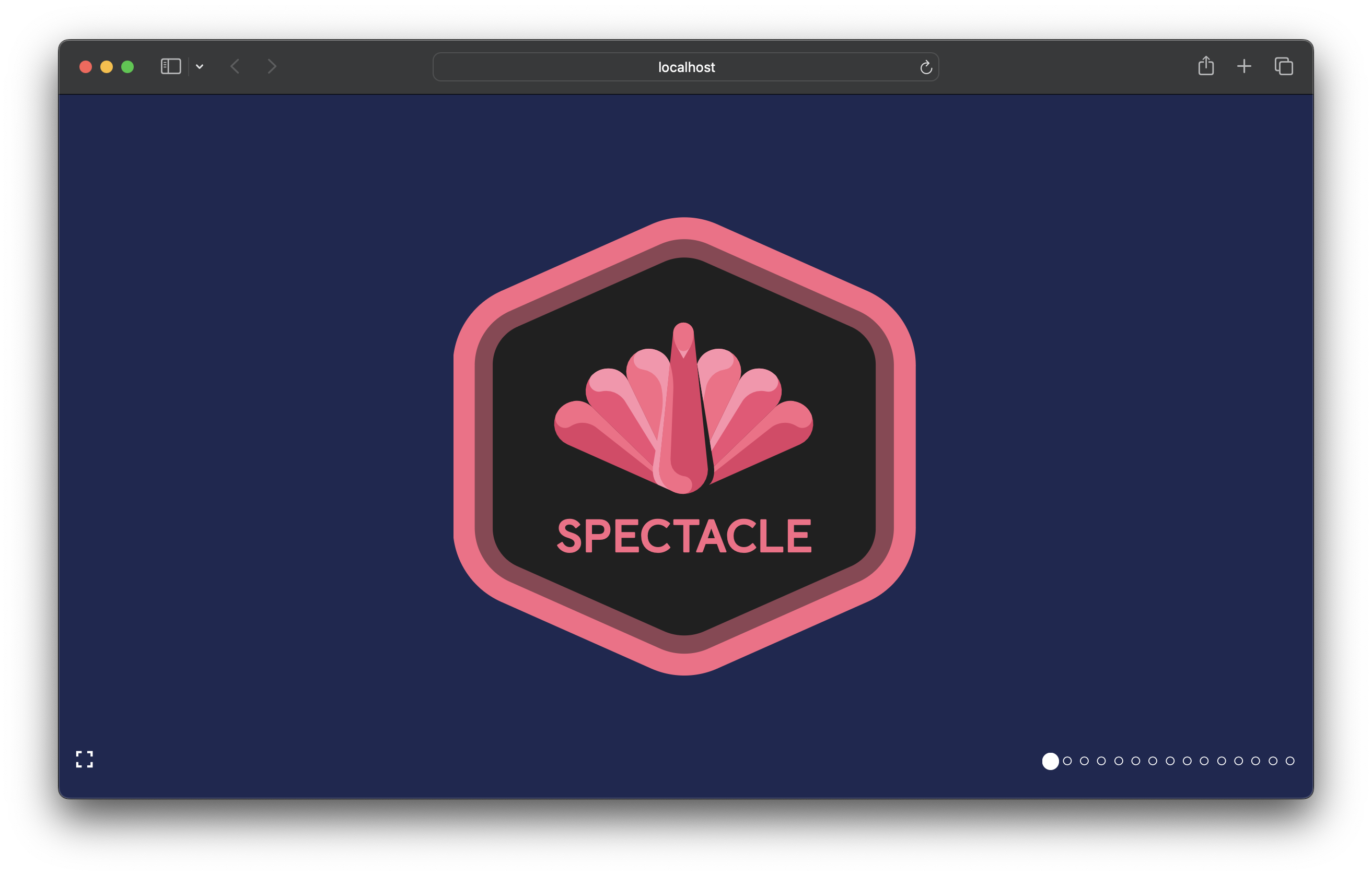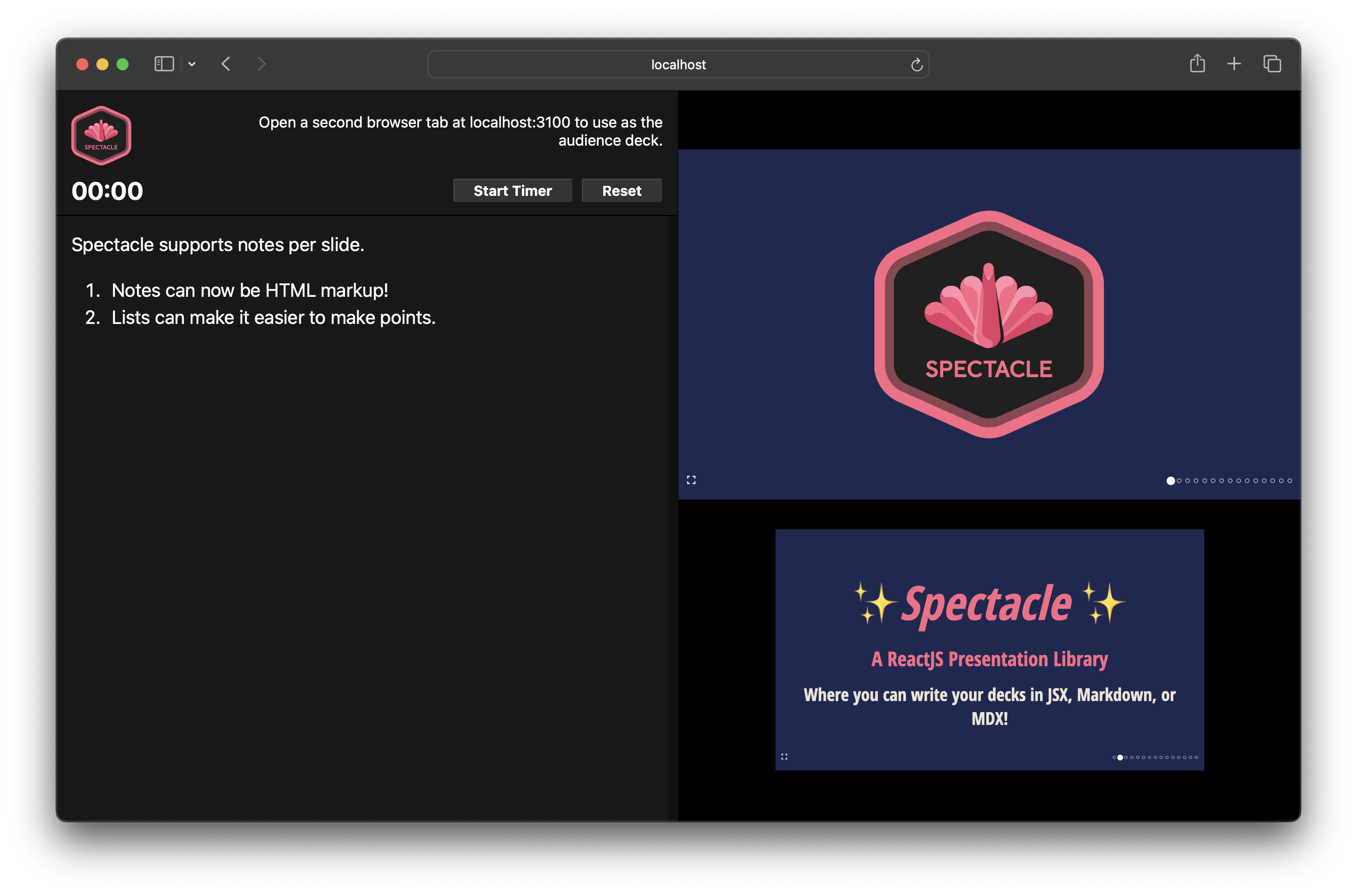 Spectacle also has a presenter mode that allows you to view your slides and notes on one screen while your audience views your slides on another. To use presenter mode, open a second browser window and visit your deck’s local server and enable it by using the key command. You can find more information about presentation controls here.